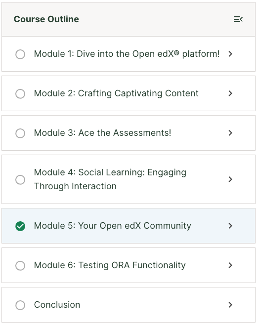 When a learner completes a course unit, the icon next to the unit name in the sidebar navigation updates to indicate that it was completed.