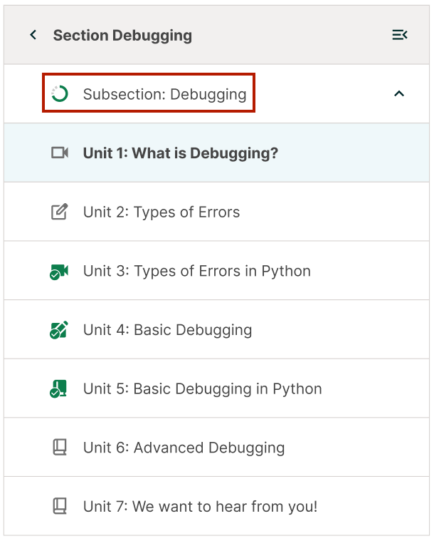 Similar to a completed the subsection, the icon next to the section name updates to a checkmark icon once the learner has completed all subsections in the section.