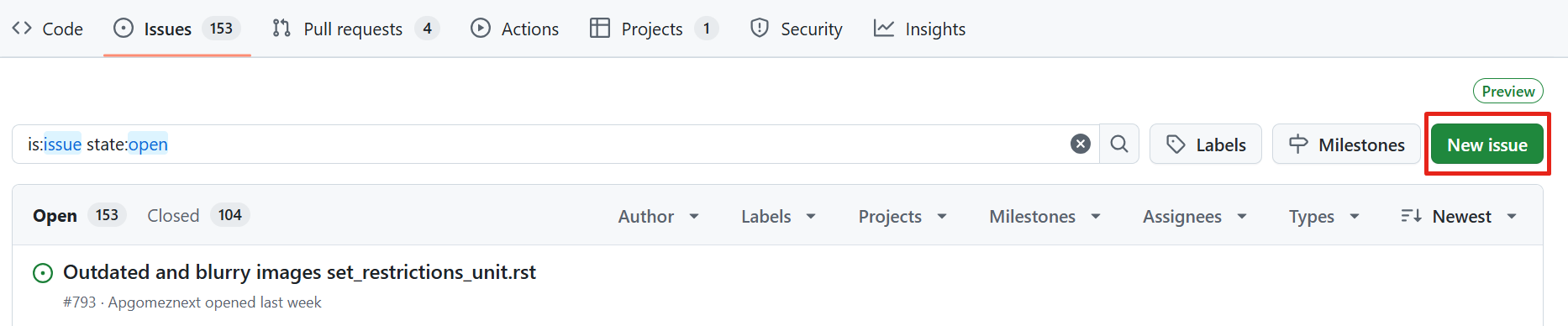 4. You will see a menu from which you can create an issue from scratch or use one of the templates already defined by the community. Regarding documentation, the recommendation is to use the template Report Issue With Existing File (for docs writers).