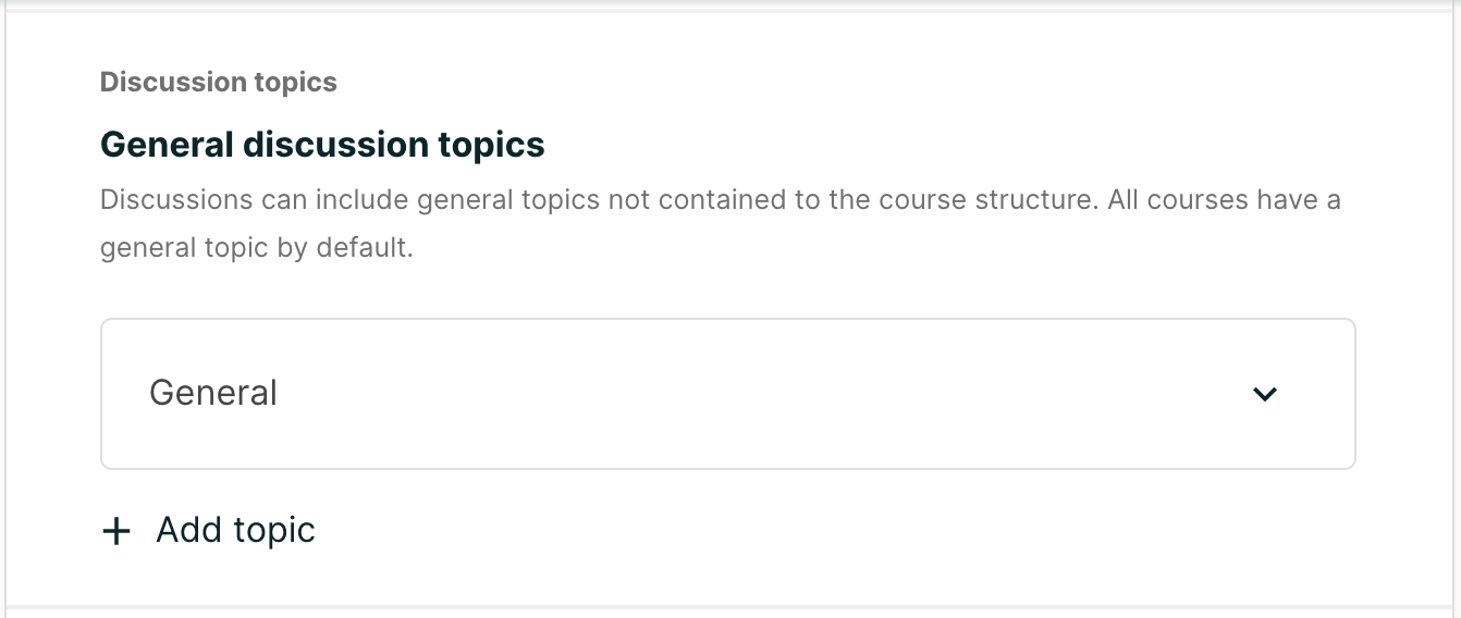Make sure each discussion topic in your course has a unique name, whether it is a course-wide topic or a content-specific discussion topic that you add as a discussion component. If different discussion topics share the same name, learners might be confused as to which discussion topic they are participating in. For example, do not add a content-specific discussion topic named “General”, because a course-wide discussion topic named “General” already exists in every course.