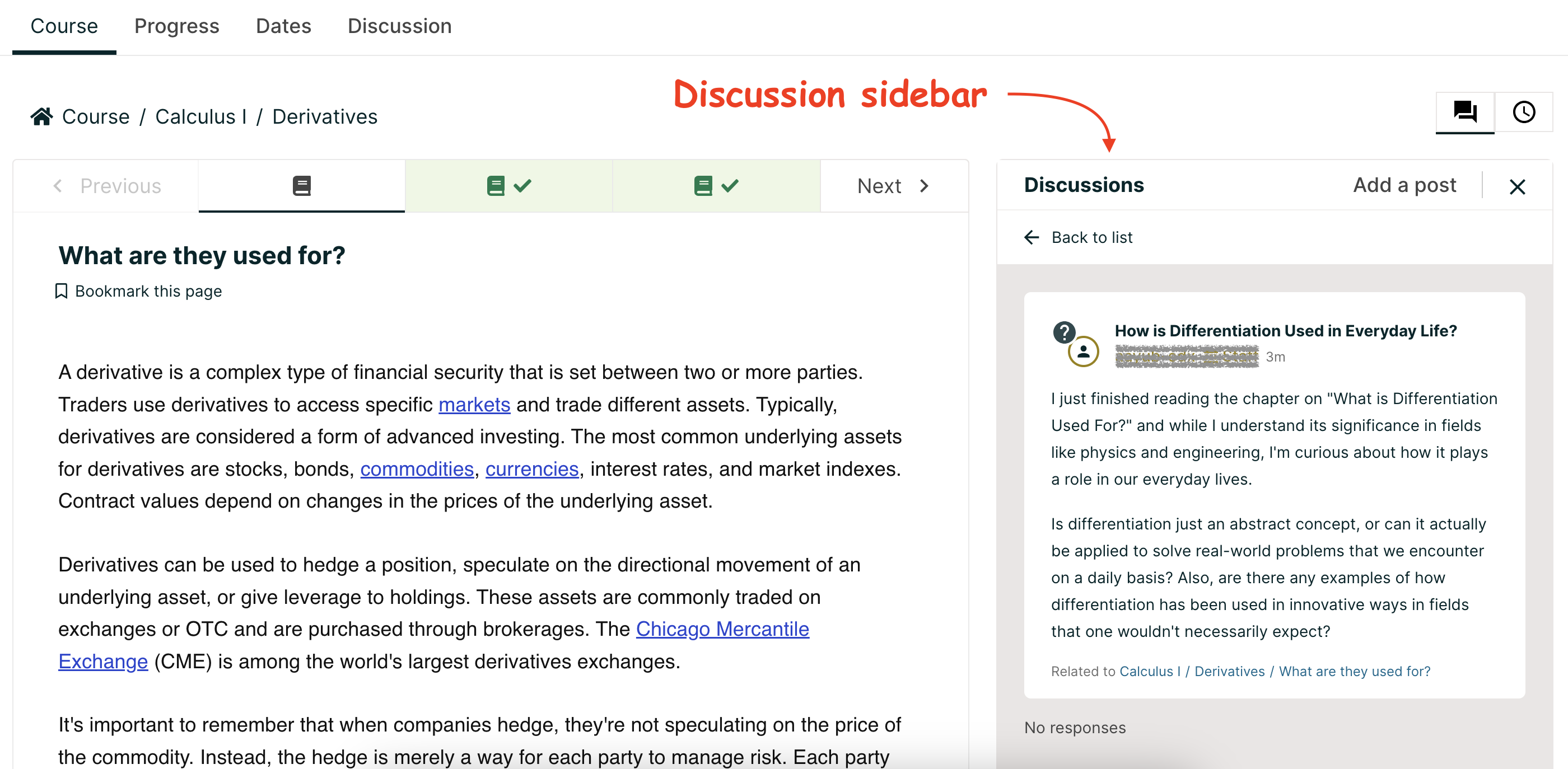 Users can participate in these discussions using the Discussion tab or via the discussion sidebar visible alongside the course unit.