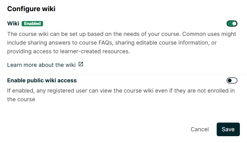 The Enable public wiki access wiki setting is disabled by default, meaning that only course team members and enrolled learners can see the course wiki. If you enable this setting, then any registered user can access the course wiki, even if they are not enrolled in your course. However, public users would have to explicitly navigate to your wiki via the wide wiki structure, or a link that has been provided to them.