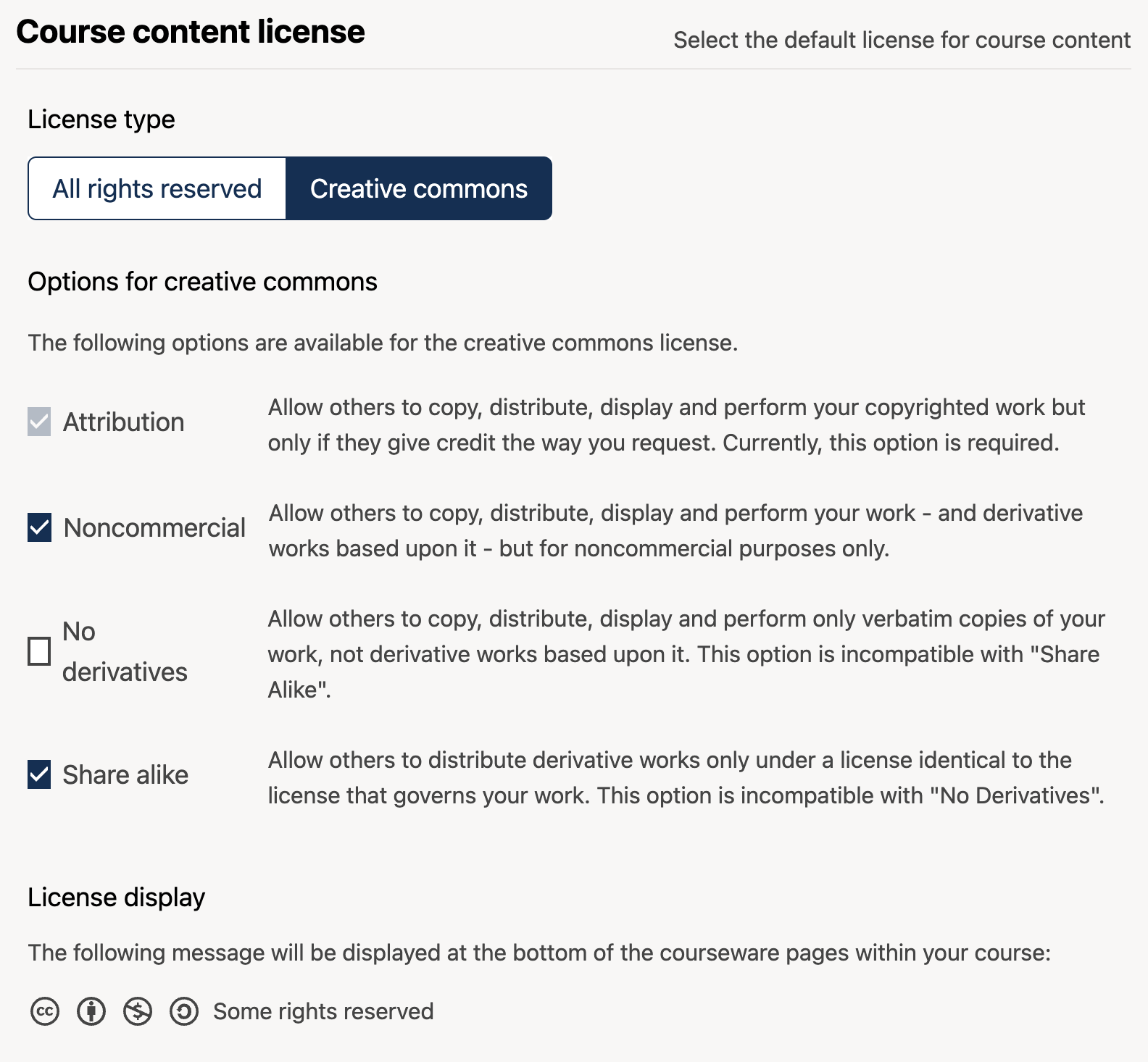 To grant learners to right to share and use course content, select Creative Commons. The Creative Commons options are displayed.