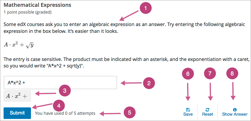 Rendered answer. For some problem types, the LMS uses MathJax to render plain text as “beautiful math.”