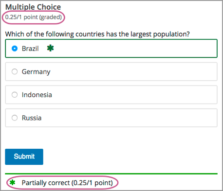By awarding partial credit for problems, you can motivate learners who have mastered some of the course content and provided a score that accurately demonstrates their progress.