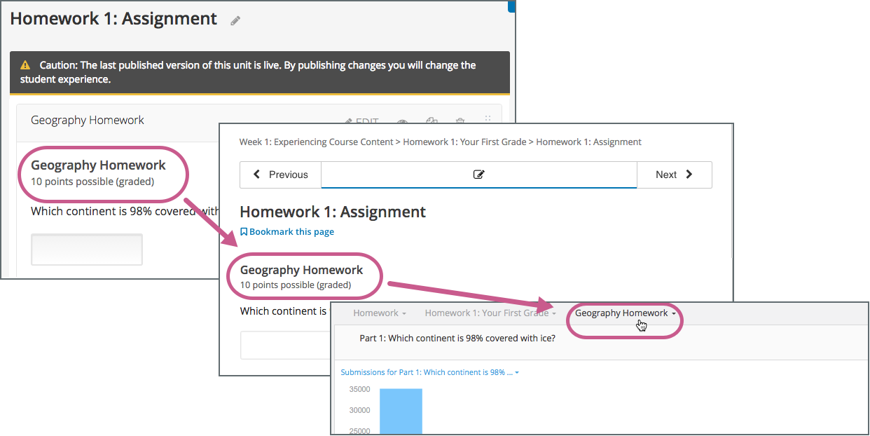 The following illustration shows the display name of a problem in Studio, and in the LMS.