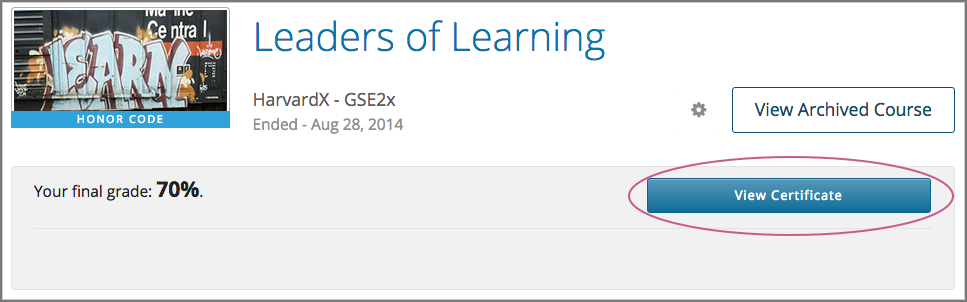 1. On your dashboard, locate the course that you want, and then select View Certificate.