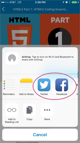 On the mobile app, select the Share icon to open a page from which you choose the social network to share your certificate to.