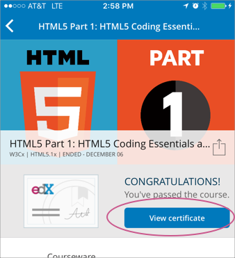 Dashboard with course name, grade, and link to the web certificate. "View certificate" button on the mobile app course page.