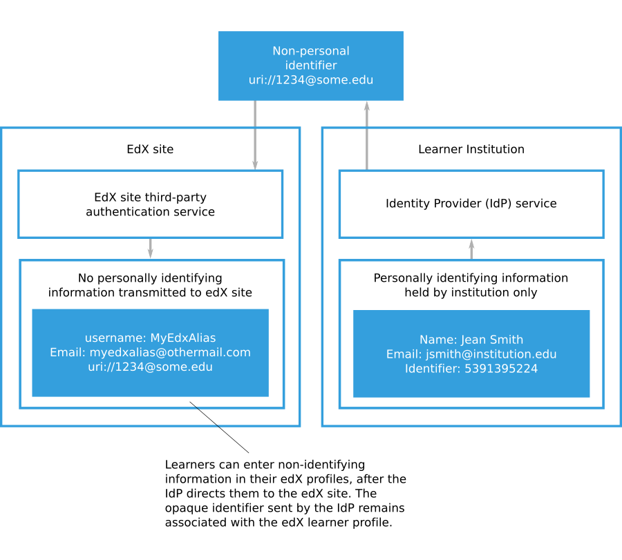 Open edX sites and Open edX Edge do not require any personally identifiable information (PII) about learners during third-party authentication. PII is information that can be used to reveal an individual’s identity, such as a name. Your identity provider (IdP) service can send only non-personal identifiers to create Open edX site accounts for learners. If you configure third-party authentication in this way, the Open edX site never receives PII from your organization.